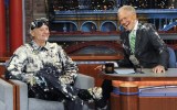 Murray didn’t let the fact he was covered in icing deter him from enthusiastically hugging Letterman and doing laps around the studio, sharing the love.