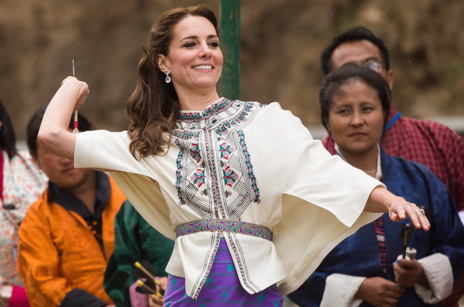 To cap off a week of sheer impracticality, Princess Kate actually did archery in a jewelled cape in Bhutan. Most of us can’t even do archery full stop. She did it in a jewelled cape. She also threw some darts and actually looked like she was genuinely enjoying herself.