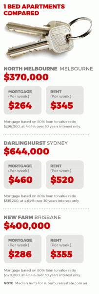 We examined the median costs of one-bedroom apartments in the inner-city suburbs of Darlinghurst in Sydney, North Melbourne in Melbourne, and New Farm in Brisbane.