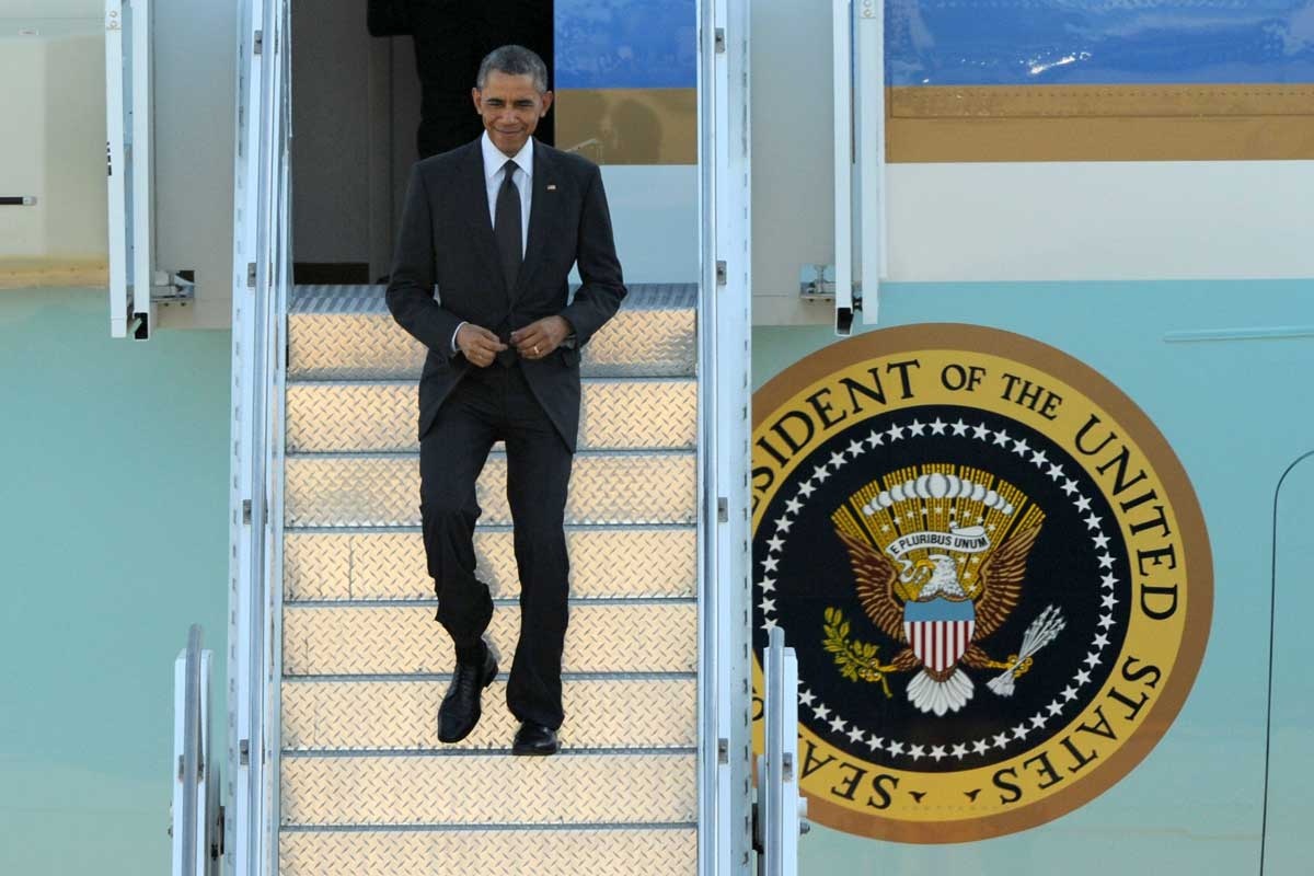Earlier, Air Force One touched down at the Amberley air force base west of Brisbane, with Governor-General Peter Cosgrove, Attorney-General George Brandis and Queensland Premier Campbell Newman there to greet the president.