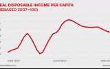 When combined with flat real wages growth, that means that real disposable income per person continues to fall, having peaked in late 2011 (see chart below).