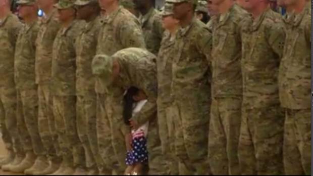 A video, since gone viral, shows the cute little girl run across the gymnasium floor in sparkly gold gumboots, and make a beeline for her camo-clad Dad.