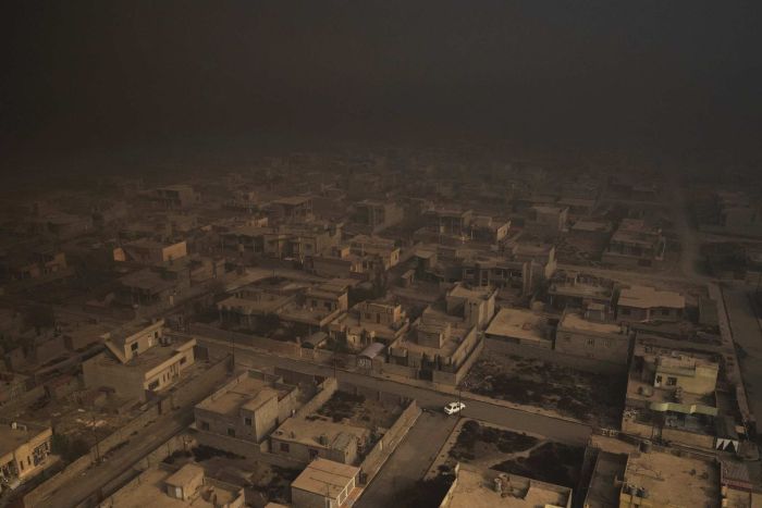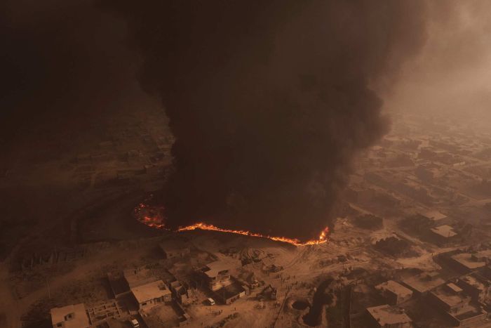 Newly released drone vision has revealed the devastation burning oil fields are having on communities near the Iraqi city of Mosul.
