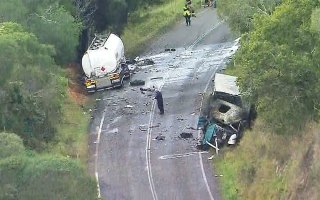 Two men have died in a catastrophic truck crash after a fuel tanker and another heavy vehicle burst into flames on a...
