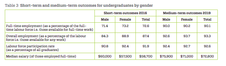 For the same cohort three years later, the gender gap in graduate median salaries had increased to $4900 or 6.5 per cent.