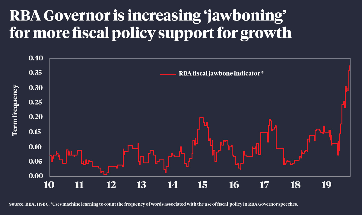 HSBC Australia chief economist Paul Bloxham has even graphed the RBA’s increasing call for fiscal help. IFM economist Alex Joiner summarised it: “First it was asking for policy assistance, then in 2015-18 it was intermittently pleading – now in 2019 it is on its knees begging.”