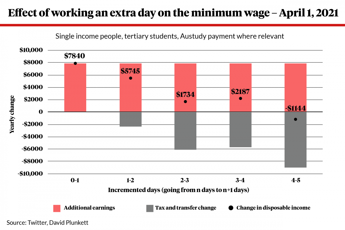 David Plunkett has graphed that – for the extra effort of working a third day each week on the minimum wage, a single-income tertiary student couple would only gain an extra $1754 over the year.