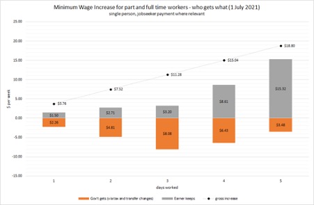 A single-income couple with one full-time minimum wage, the other on JobSeeker, only increased their disposable income by $2. Put another way, they only retained 18 per cent of the increase.
