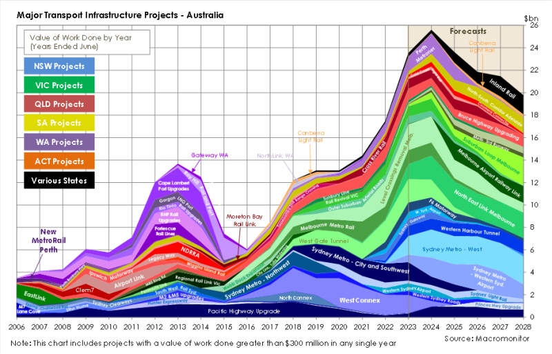 Macromonitor’s graph shows the sharp decline beyond 2023-24 in big ticket projects with a minimum annual spend of $300 million with NSW and Victoria, having spent the most, starting to fall the most.