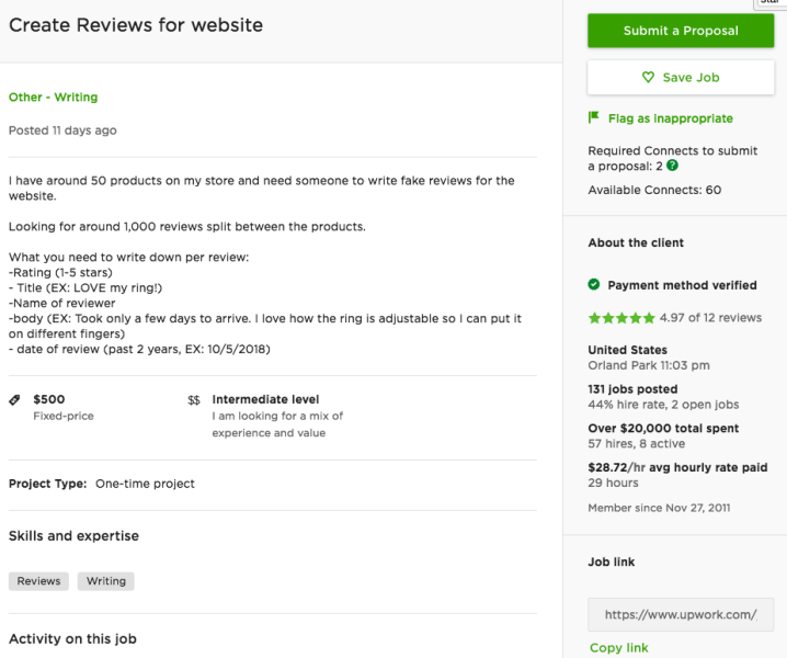 The New Daily found job listings on freelancing websites such as Upwork and Freelancer.com, with advertisers seeking “fake review writers”.