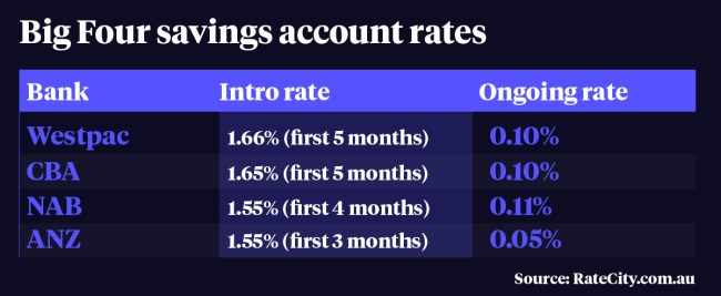 Australia’s big four banks have moved one step closer towards zero-interest savings accounts, with the lowest base rate on offer now sitting at just 0.05 per cent.