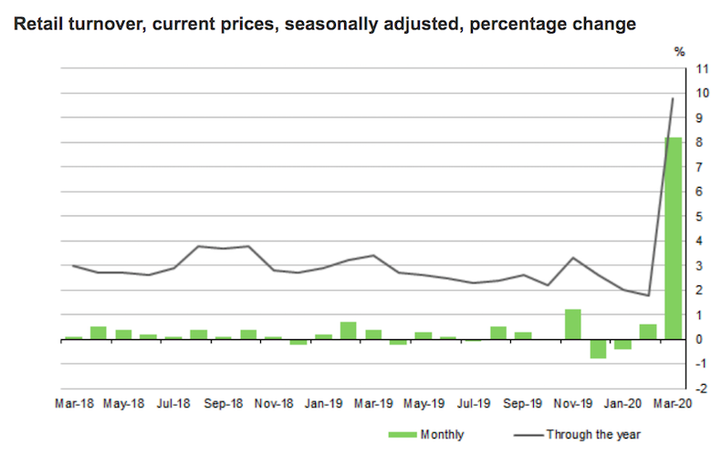 Preliminary figures show retail turnover jumped 8.2 per cent in March 2020 – eclipsing the previous record of 8.1 per cent when consumers rushed to buy goods before the introduction of GST on July 1, 2000.
