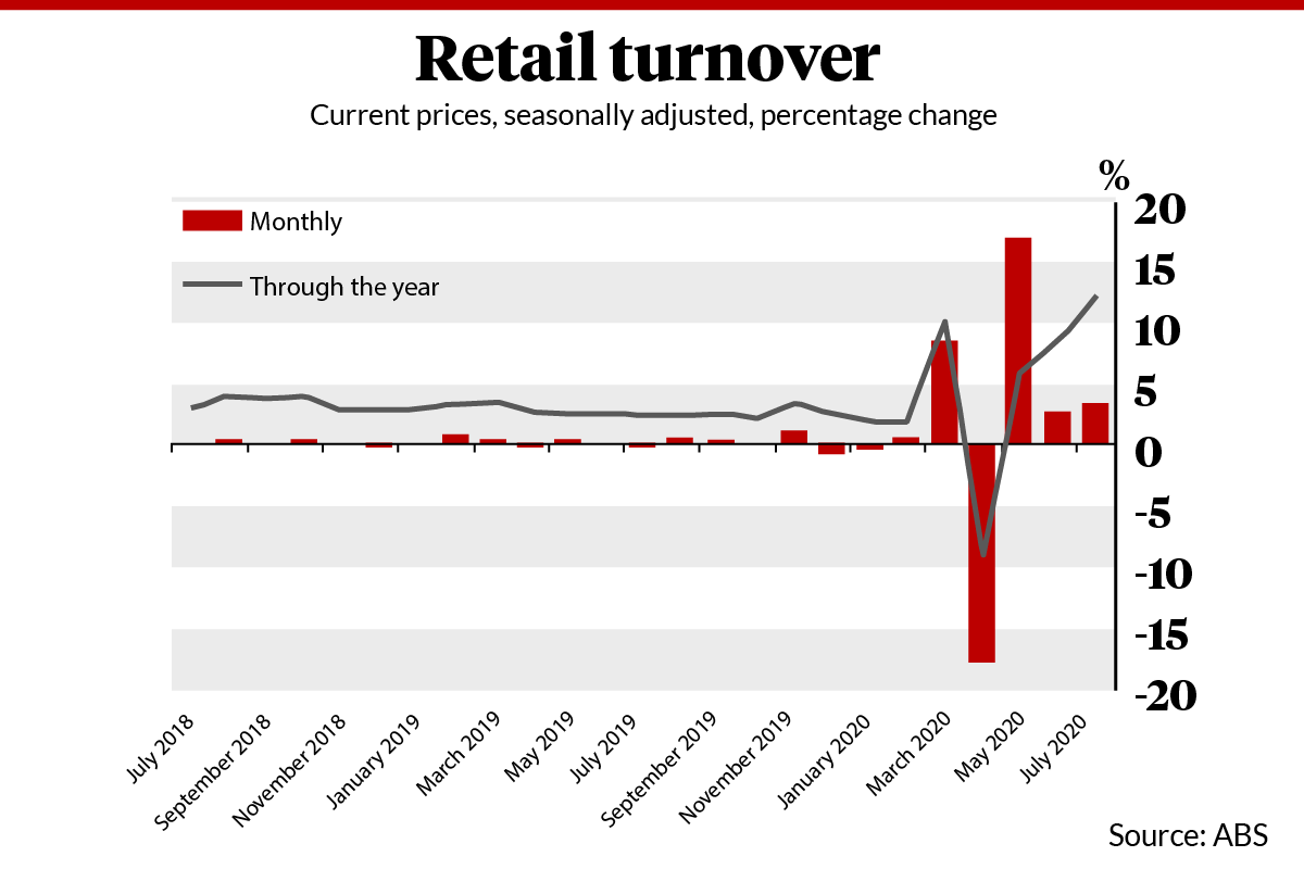 ABS data shows sales in July were up 12.2 per cent on the same time last year, as stimulus payments flowed into bank accounts and stay-at-home orders encouraged workers to feather their nests.