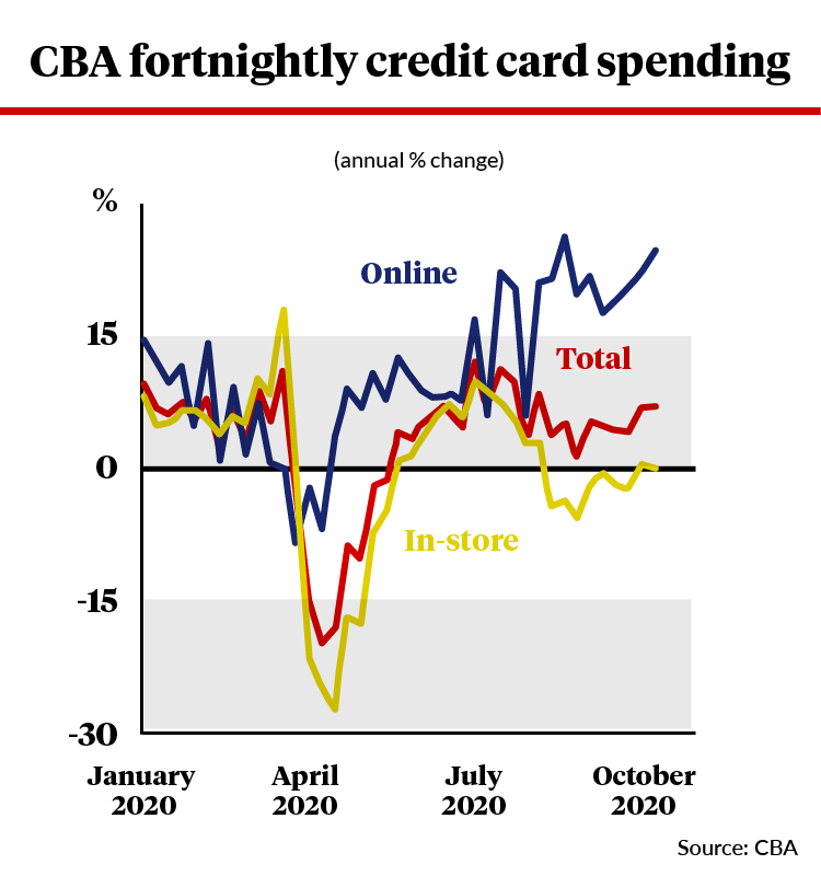 Online spending was 40 per cent higher than the same time last year in Victoria and 25 per cent higher nationally, while national in-store spending was tracking at 2019 levels.