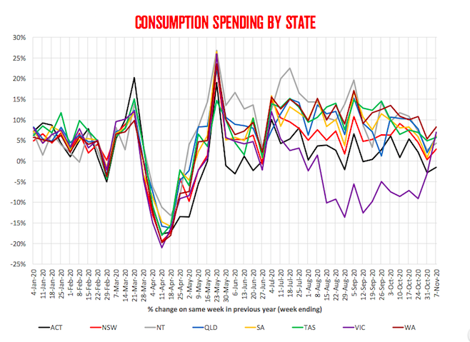 Overall consumer spending in the week ending November 7 was 8.3 per cent higher year on year in Western Australia; 7 per cent higher in Victoria; 6.1 per cent in SA; 5.9 per cent in Queensland; and 2.9 per cent in New South Wales.