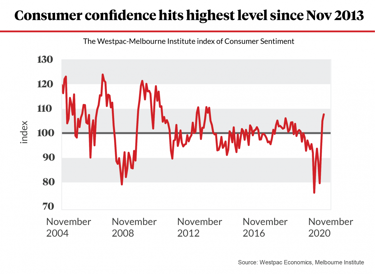 A monthly survey released by the Melbourne Institute and Westpac on Wednesday showed consumer confidence rising to a seven-year high in November.