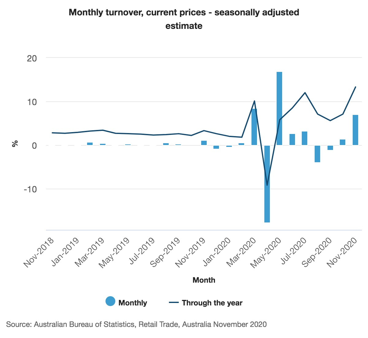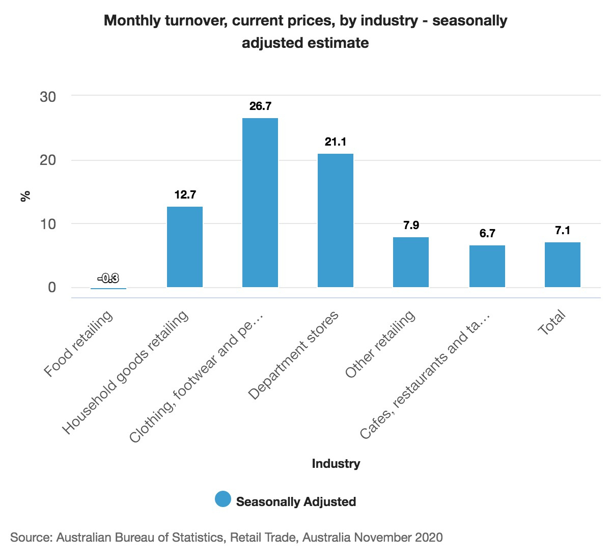 “At the industry level, rises were recorded in household goods retailing (12.7 per cent), clothing, footwear and personal accessory retailing (26.7 per cent), other retailing (7.9 per cent), department stores (21.1 per cent), and cafes, restaurants and takeaway food services (6.7 per cent) in November 2020,” the ABS said in a statement.