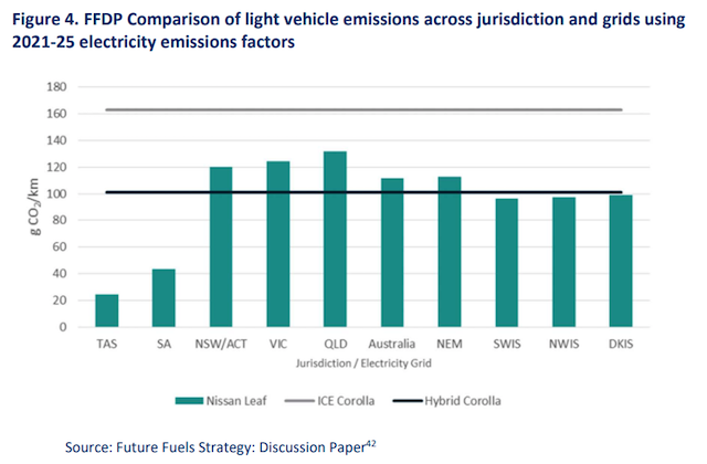 “When 20 per cent off-grid renewable electricity charging is included, the emissions intensity profile of EVs falls below that of the hybrid for every Australian grid, and well below the [internal combustion engine] vehicle,” the submission states.
