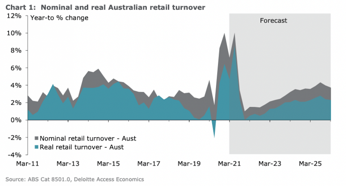 Forecasts released by Deloitte Access Economics on Monday predict that annual growth in retail spending is expected to reach a massive 5.9 per cent in 2020-21 – the strongest gain in a decade.