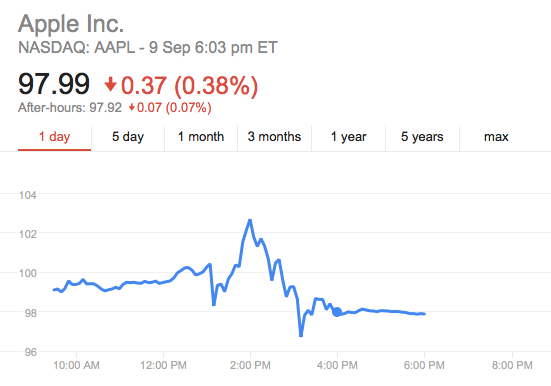 The shares peaked at US $102.69 following the unveiling of the Apple Watch, but had fallen to US $97.99 two hours later.