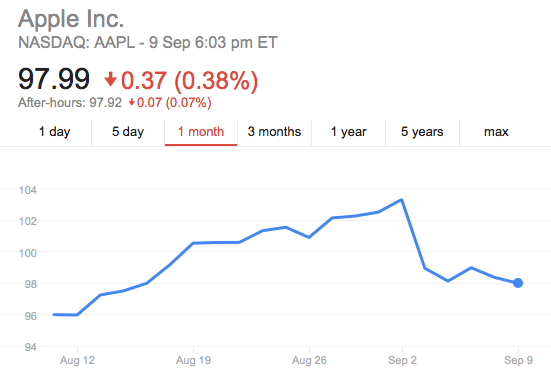 Apple share prices have dropped to a one-month low just hours after the unveiling of the new iPhone and Apple Watch overnight, despite surging during the announcement.