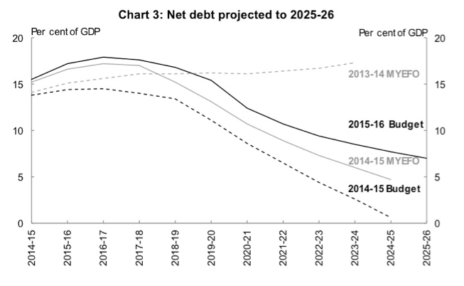 Let’s be clear, a net federal debt that peaks at $313.4 billion (18 per cent of GDP) in 2016-17 is not good. It’s just not bad enough to justify the cuts the government tried to make last year.