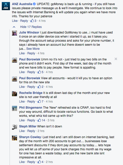 However, frustrated customers berated ANZ on social media for the outage and for not providing regular updates on progress made to fix the system.