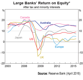 Only Australian and Canadian banks have maintained returns on equity of around 15 per cent during the financial crisis and its ongoing fallout, while Japan, USA, the UK and Europe have remained below 10 per cent, according to the Reserve Bank.