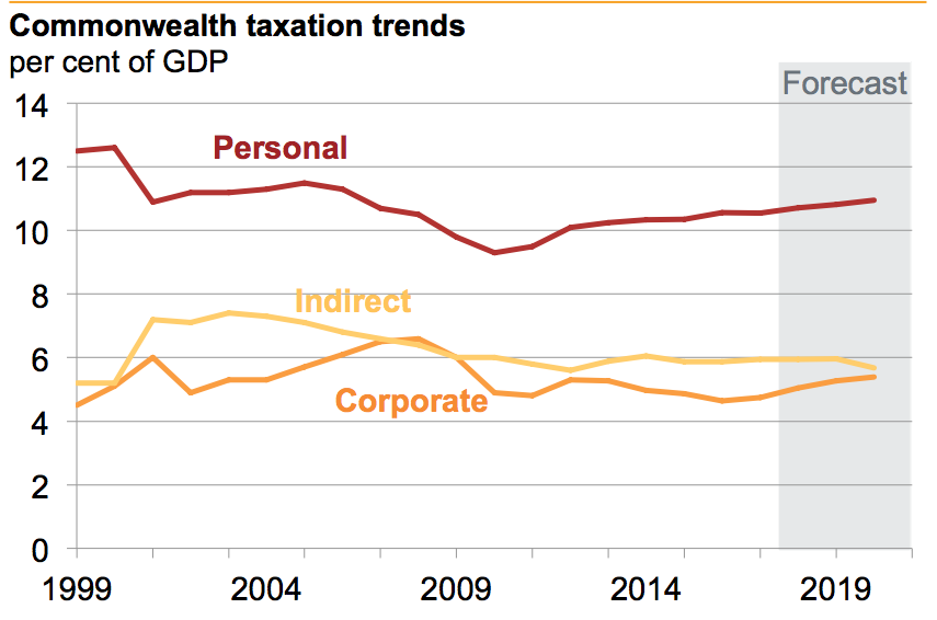 This analysis from the Grattan Institute shows that all the major tax categories – personal, company and indirect (mainly GST) – have slid markedly as a percentage of the economy in 10 years.
