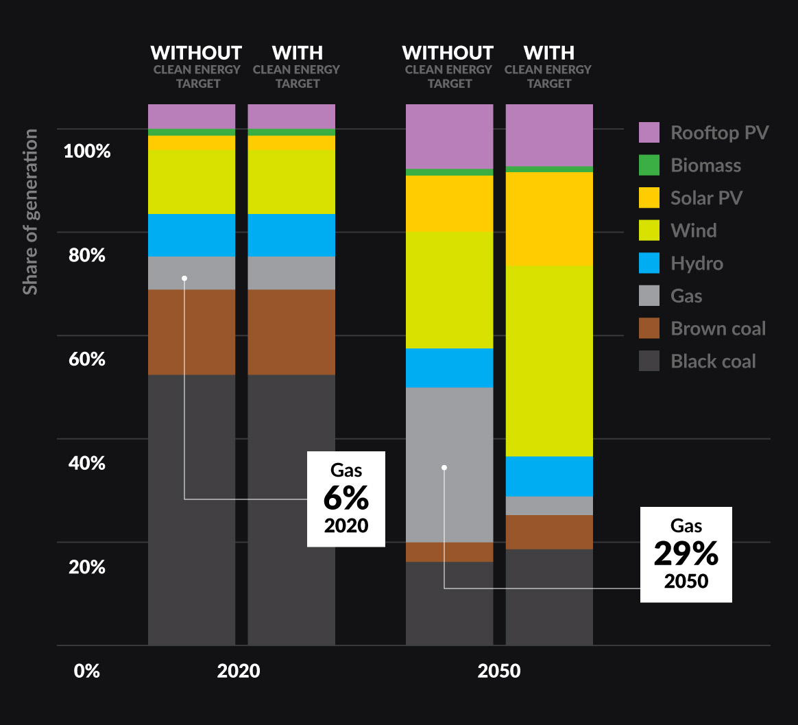 Crucially, the target would significantly reduce gas-fired power generation from 29 per cent to 3 per cent in 2050.
