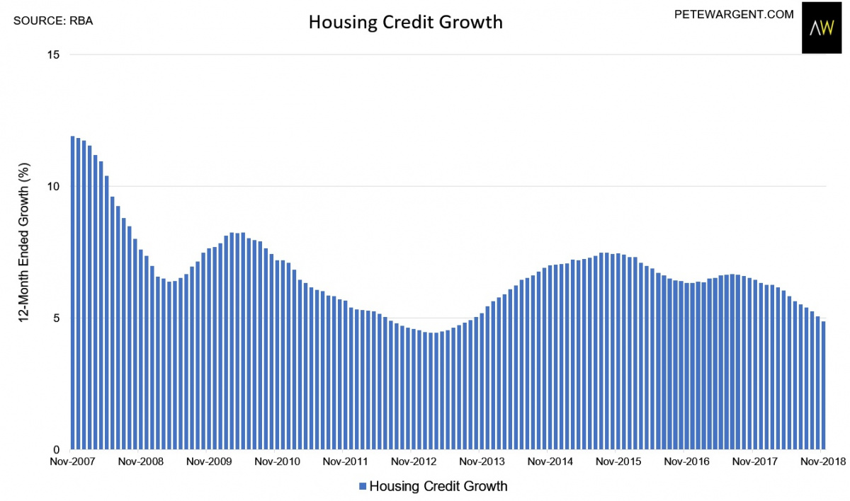 As you can see in the chart below, changes in the direction of housing credit growth have tended to lead to changes in dwelling price growth.