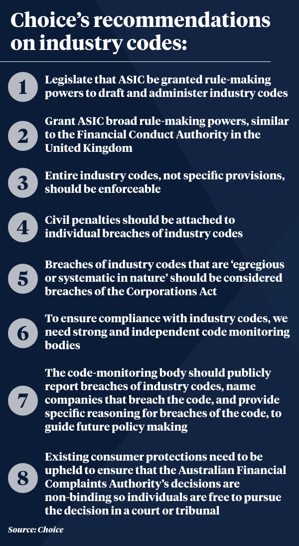 In a submission to Treasury, Choice said banks and financial lobby groups have consistently created “weak, unenforceable and ineffective” codes of conduct for themselves in the past, and responsibility for writing the rules should instead be handed to regulator Australian Securities and Investments Commission (ASIC).