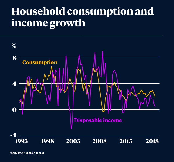 Firstly, the RBA knows full well the consumer can be nothing but constrained after years of negative real take-home wages.