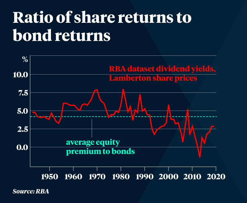 It measures returns from shares compared with no-risk bond yields, and shows that since the end of the GFC, investors have been prepared to take on sharemarket risk more cheaply. The average premium for equity returns over bonds has been 4 per cent, whereas now the figure has shrunk to around 2.5 per cent.