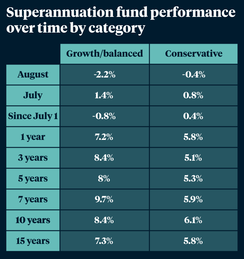 The table above demonstrates the influence of choosing a more conservative option that has a higher exposure to defensive assets. While the growth option has fallen 2.2 per cent in August, the conservative option is only down 0.4 per cent.