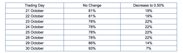 Senior currency strategist with Westpac Sean Callow said the market is forecasting a 25 per cent chance of a rate cut before Christmas, and 50 per cent on a cut in February.