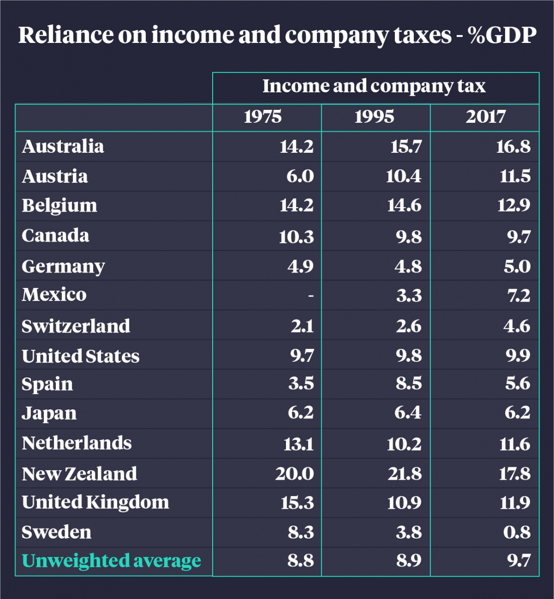 And unlike all other countries on the list in double figures, Australia has a higher reliance on income taxes now than it did back in 1975.That is despite the introduction of the goods and services tax in 2001 which increased our reliance on indirect taxes.
