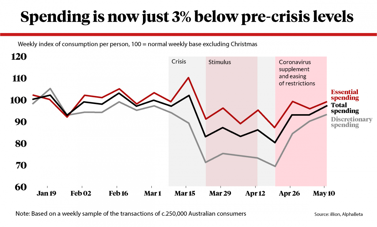 New data from credit bureau illion and Accenture-owned AlphaBeta shows consumer spending has now recovered to just 3 per cent below pre-crisis levels.