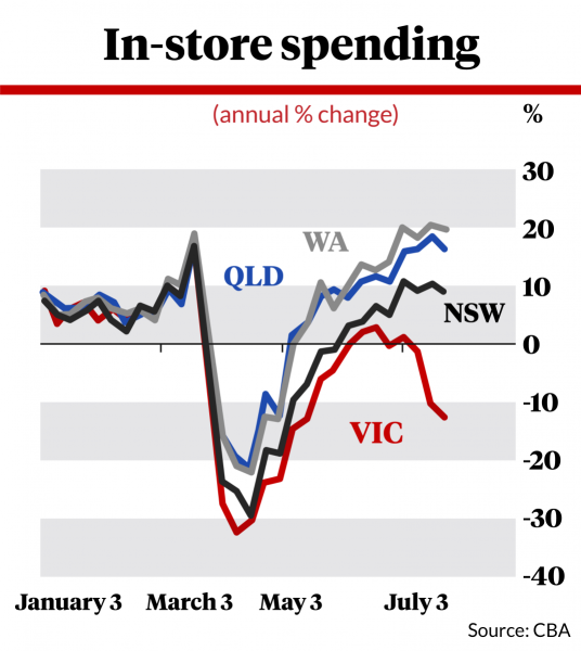 As for the changing face of consumer spending, locked-down Victorians have naturally substituted in-store spending for online shopping, driving up the latter category 43 per cent on the same time last year, compared to a decrease of 6 per cent two weeks ago.