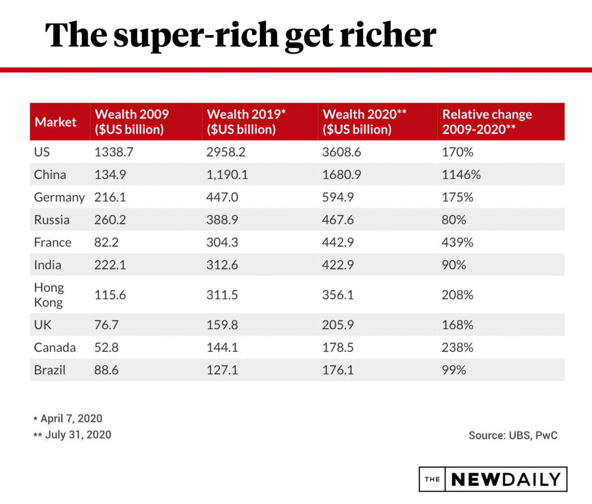 Total billionaire wealth across the world rose by 27.5 per cent during the early stages of the pandemic and hit a record $US10.2 trillion ($14.2 trillion) on July 31.
