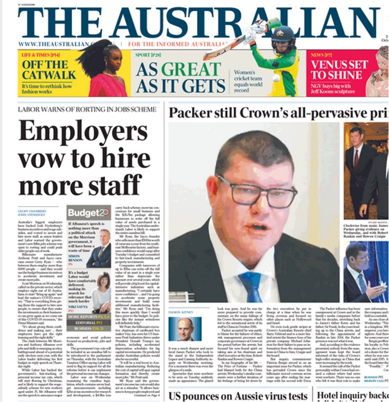 “Employers vow to hire more staff” proclaimed the Page 1 headline, but if anyone bothered to read the story, they would find just two such employers – avowed Trump and Liberal fan Anthony Pratt, whose thriving Visy packaging and recycling business could well pick up some extra government money, and Gerry Ryan, whose Jayco caravan business is absolutely booming anyway, if anything helped by the pandemic forcing Australians to holiday at home.