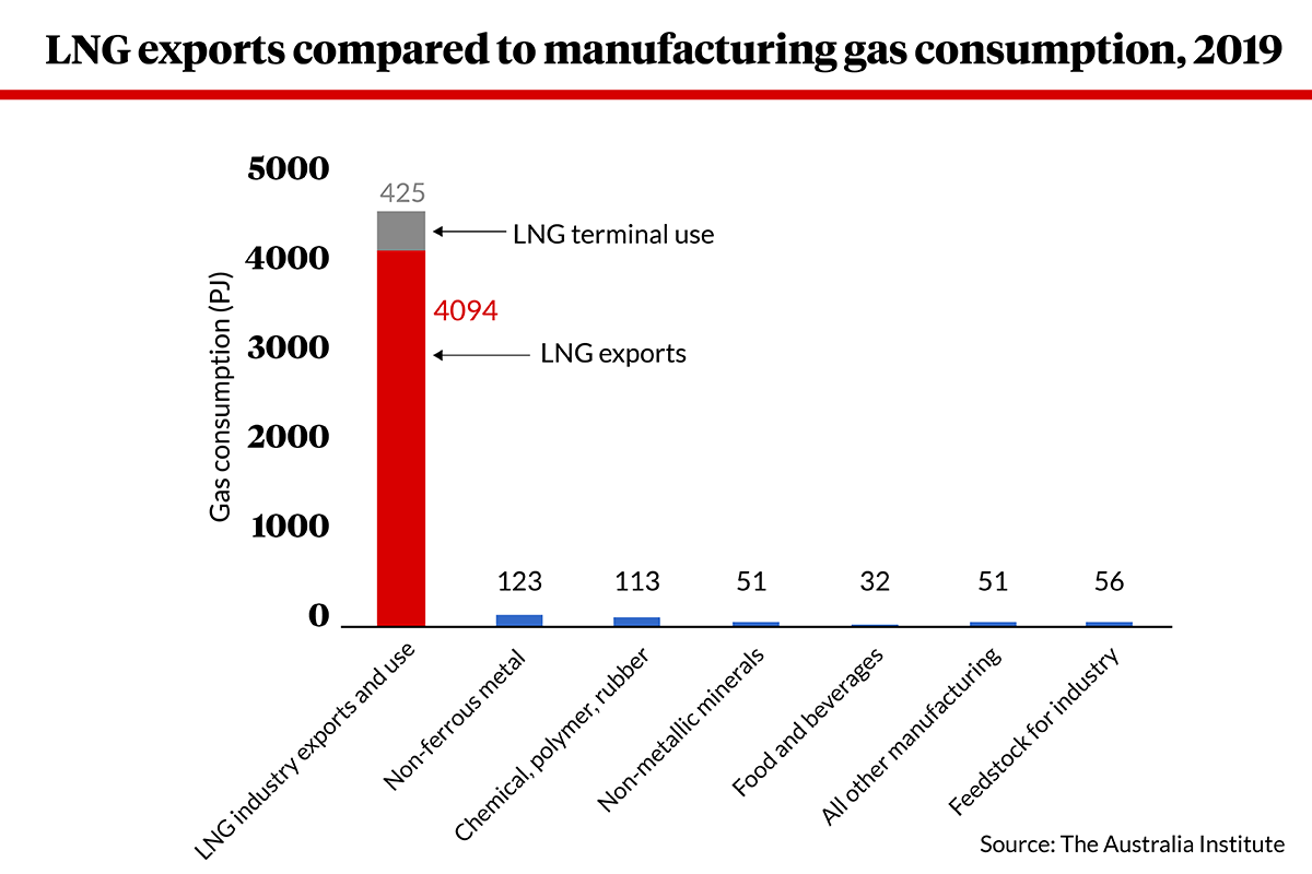 Not least because 82 per cent of Australian gas is exported overseas and the LNG export industry uses 40 times the amount of gas used by the chemical, polymer and rubber manufacturing industry.