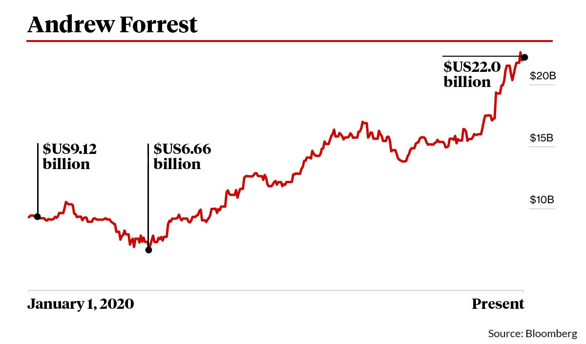 Mining magnate and philanthropist Andrew Forrest’s wealth increased by $US15.3 billion ($20.2 billion), while Atlassian co-founders Scott Farquhar and Mike Cannon Brookes’ fortunes jumped by roughly $US7.1 billion ($9.6 billion) since March’s sharemarket crash.