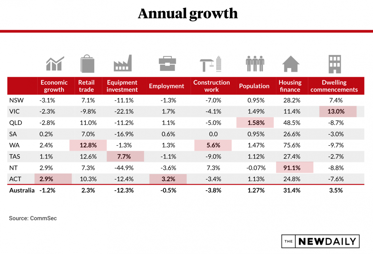 The Northern Territory, meanwhile, remained in last place (8th), as its largely project-based economy suffered from a 109 per cent quarterly decline in population growth versus its decade average.
