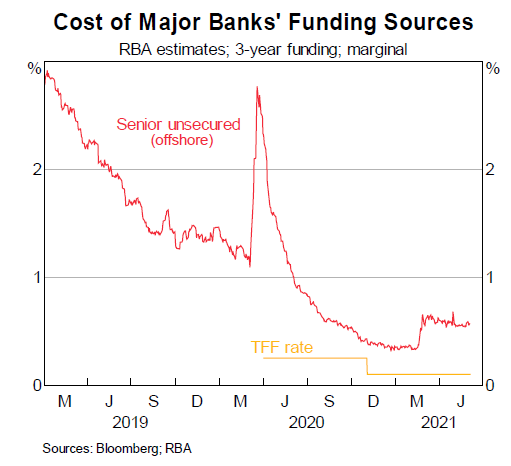 As the chart above shows, the TFF money the banks are borrowing will have to be replaced by other funding sources, like offshore loans, for which they can expect to pay at least 0.5 per cent.