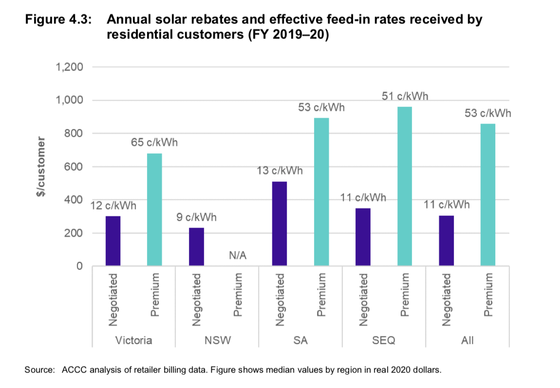 Solar households that cannot access premium rebates and instead negotiate feed-in tariffs with retailers were paid a premium rebate of just $307 in financial year 2019-20, the ABS said.