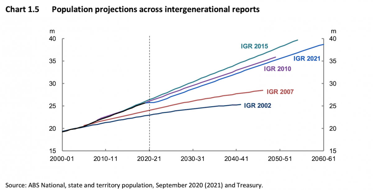 And long-term population projections have been revised down. The 2015 IGR projected that Australia’s population would reach almost 40 million by 2054-55, but the delayed 2021 IGR projects it will be 38.8 million in 2060-61.