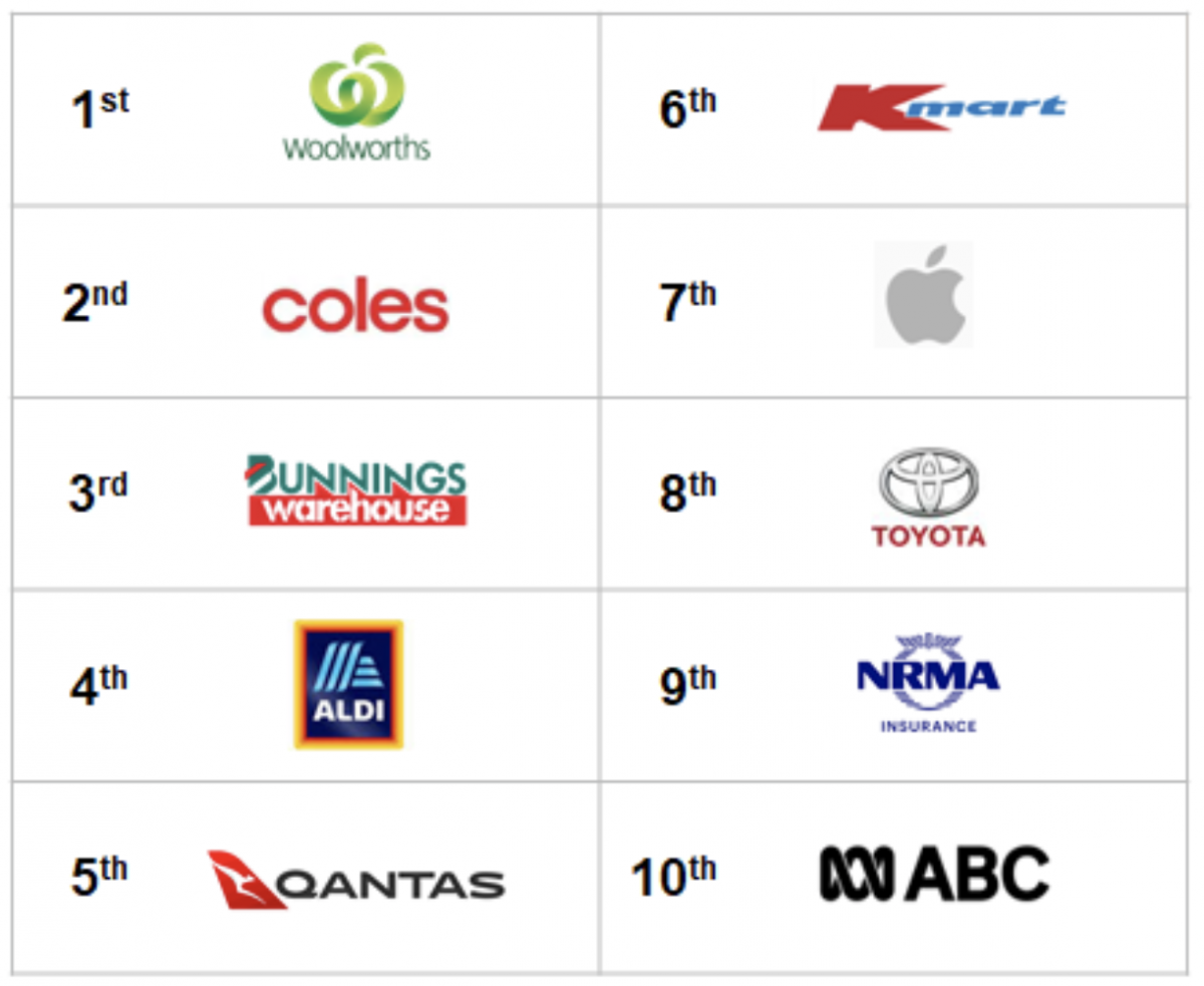 Aldi ranked fourth, Qantas came in fifth and discount favourite Kmart was 6th.