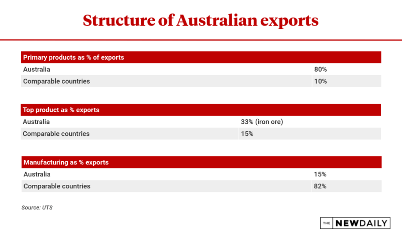 “We have 80 per cent of our exports made up of primary production [agriculture and mining] and for similar countries the average is 15 per cent,” Dr Laurenceson said.
