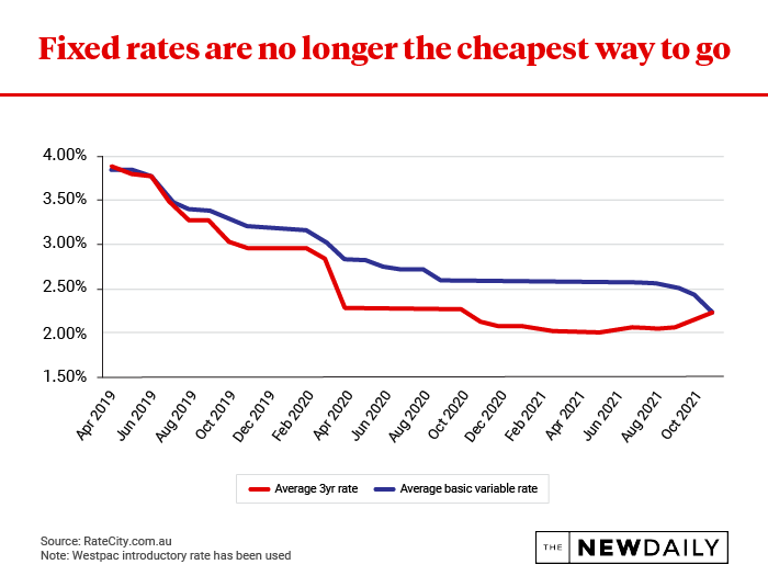 As the above chart shows three-year fixed mortgage rates are now sitting at approximately the same level as the standard variable rate, meaning the advantage of borrowing three years fixed has vanished.